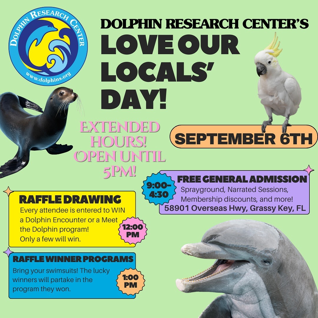 Home / This event has passed. « All Events DOLPHIN RESEARCH CENTER’S LOVE OUR LOCALS DAY September 6, 2025 @ 9:00 am – 5:00 pm Dolphin Research Center (305) 289-1121 View Organizer Website Dolphin Research Center 58901 Overseas Highway Marathon, FL 33050 United States + Google Map 305-289-0002 View Venue Website Add to calendar Google Calendar iCalendar Outlook 365 Outlook Live