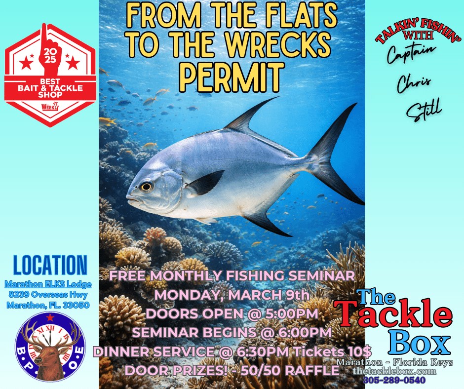 Home / This event has passed. « All Events FREE MONTHY FISHING SEMINAR- FROM THE FLATS TO THE WRECKS PERMIT March 9 @ 5:00 pm – 9:00 pm The Tackle Box Marathon FL 305-289-0540 View Organizer Website Marathon Elks Lodge 2139 8239 Overseas Hwy Marathon, FL 33050 United States + Google Map 305-743-2652 View Venue Website Add to calendar Google Calendar iCalendar Outlook 365 Outlook Live