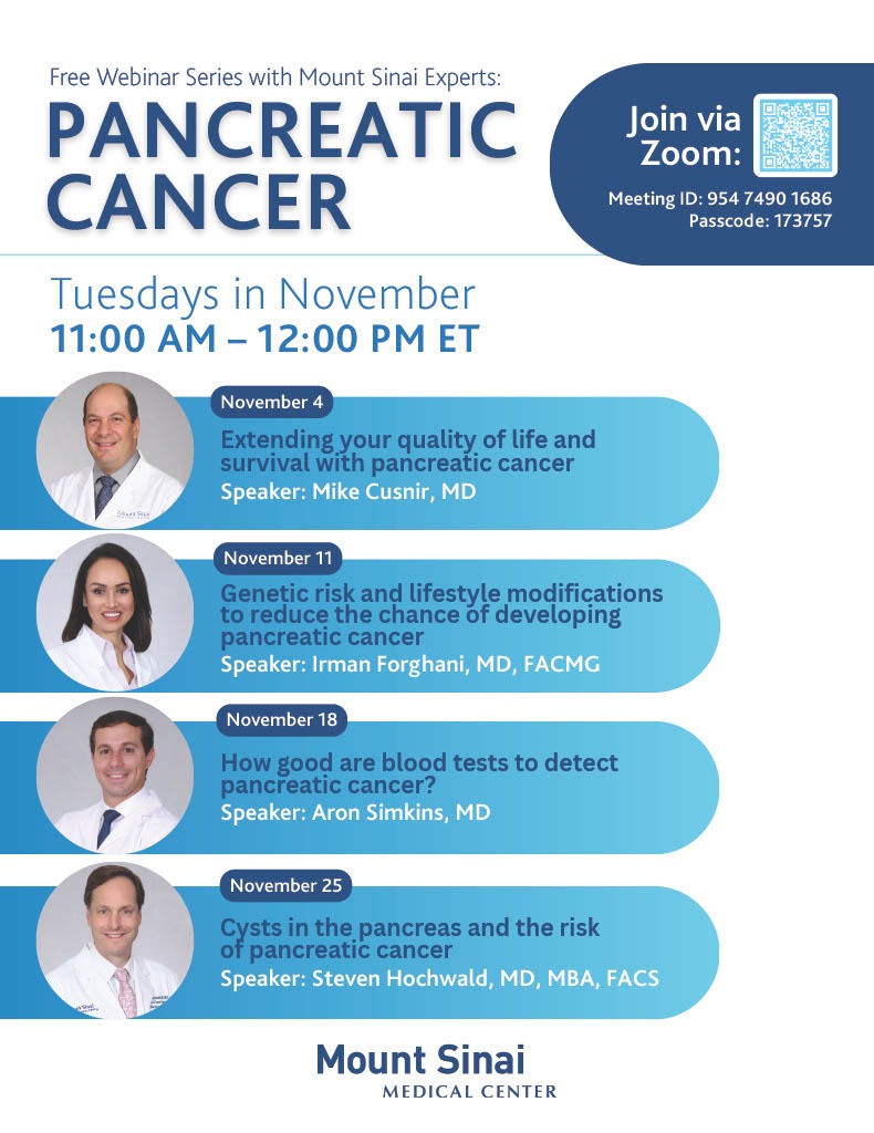 Home / « All Events FREE WEBINAR WITH MOUNT SINAI EXPERTS- PANCREATIC CANCER November 11 @ 11:00 am – 12:00 pm Add to calendar Google Calendar iCalendar Outlook 365 Outlook Live