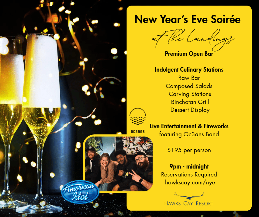 NYE Soiree at The Landings – An adults-only New Year’s Eve celebration awaits at The Landings. Sip, savor, and celebrate with indulgent culinary stations, a premium open bar, live music, and spectacular fireworks display at midnight. https://www.hawkscay.com/nye/nye-reception-21/