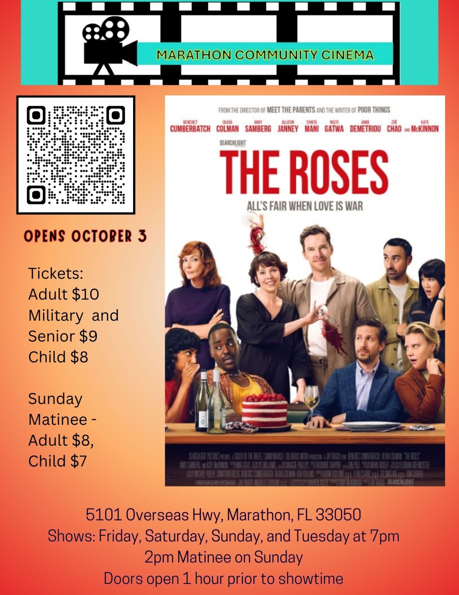 Home / This event has passed. « All Events OPENING NIGHT – THE ROSES October 3 @ 7:00 pm – 9:00 pm Marathon Community Cinema 5101 Overseas Hwy Marathon, FL 33050 United States + Google Map 305-743-0288 View Venue Website Add to calendar Google Calendar iCalendar Outlook 365 Outlook Live
