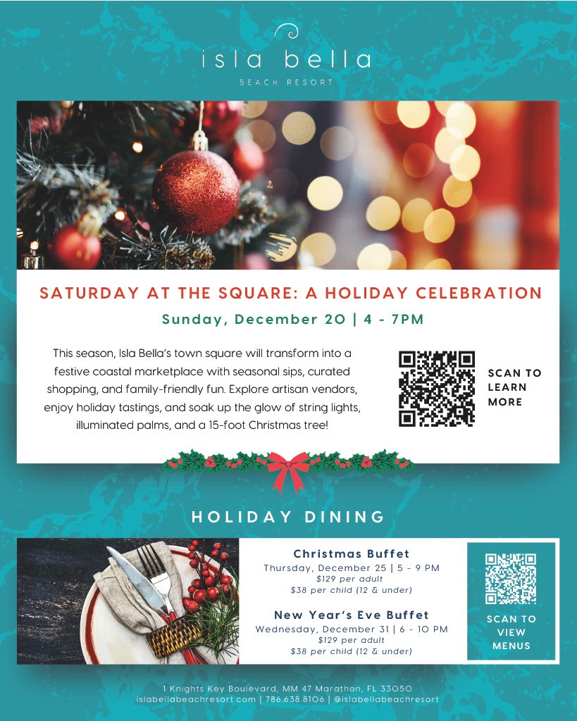 Home / « All Events SATURDAY AT THE SQUARE – A HOLIDAY CELEBRATION November 20 @ 4:00 pm – 7:00 pm Isla Bella Beach Resort 1 Knights Key Boulevard MM 47 Marathon, FL 33050 United States + Google Map 305-481-9451 View Venue Website Add to calendar Google Calendar iCalendar Outlook 365 Outlook Live