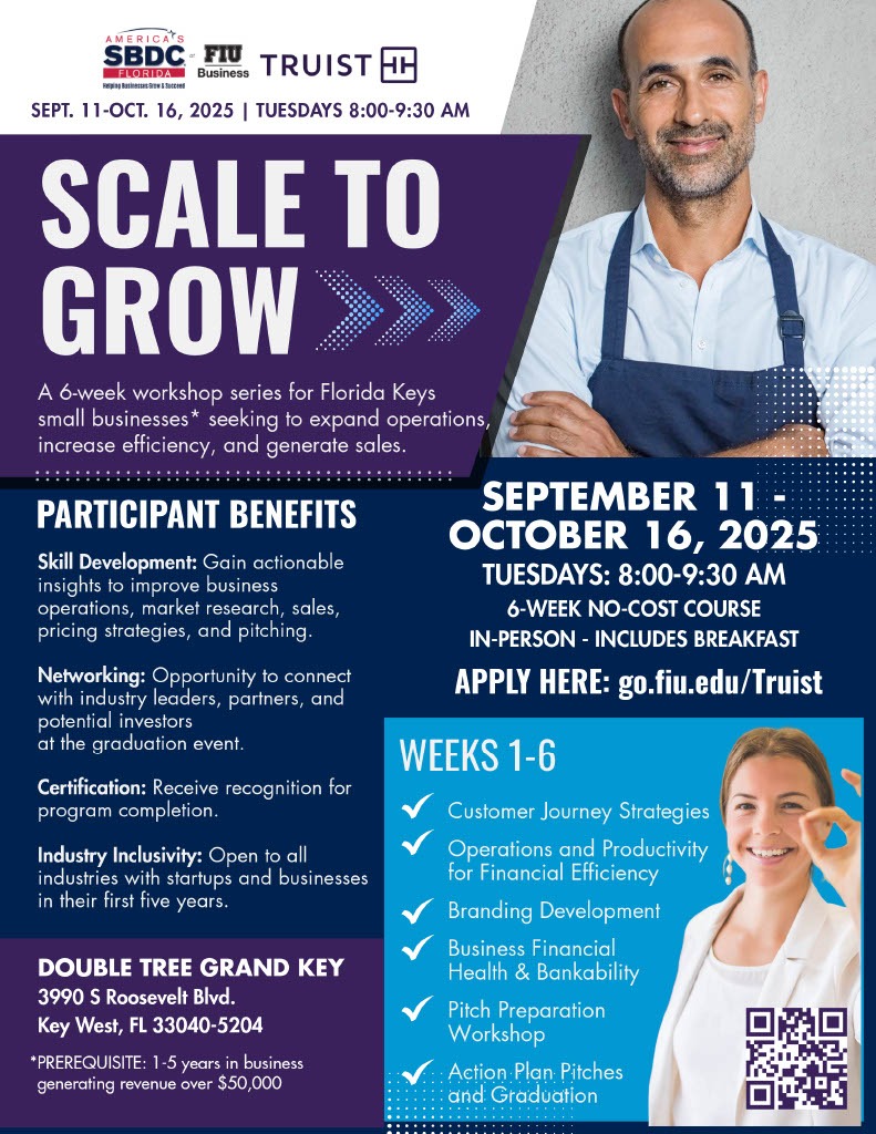 Home / This event has passed. « All Events SCALE TO GROW – 6WEEK WORKSHOP FOR FLORIDA KEYS SMALL BUSINESSES September 11, 2025 @ 8:00 am – October 16, 2025 @ 9:30 am Add to calendar Google Calendar iCalendar Outlook 365 Outlook Live