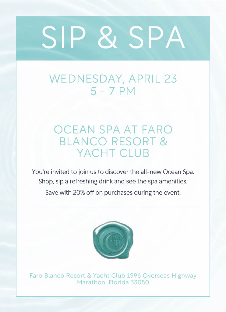 Home / This event has passed. « All Events SIP & SPA April 23, 2025 @ 5:00 pm – 7:00 pm Faro Blanco Resort & Yacht Club 305-743-1234 View Organizer Website info@faroblancoresort.com Faro Blanco Resort and Yacht Club 1996 Overseas Hwy Marathon, FL 33050 United States + Google Map 305-743-1234 View Venue Website Add to calendar Google Calendar iCalendar Outlook 365 Outlook Live