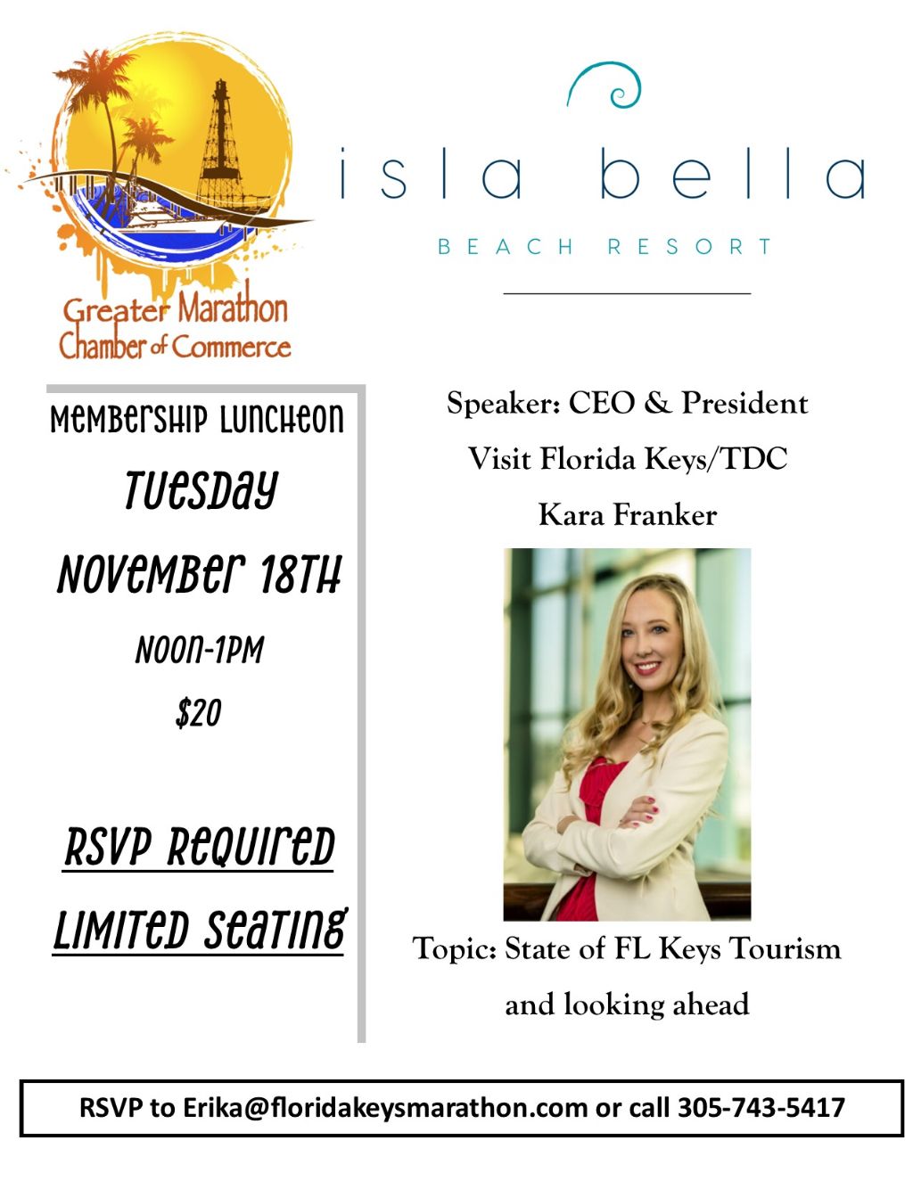 Luncheons: 50+ in attendance/monthMembers-only eventKeynote speaker each month on a business-related topic.Normally every 3rd Tuesday of the Month.12:00 - 1:00 pm$20 per personPlease RSVP to Erika@floridakeysmarathon.com Not a member yet? Call Amanda! She can help get you joined! 305-743-5417
